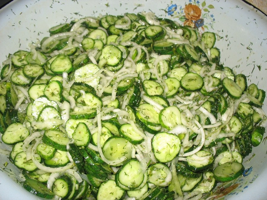 1. Нарезать лук-полукольцами, огурцы кружочками. Смешать и дать постоять минут 15-20.