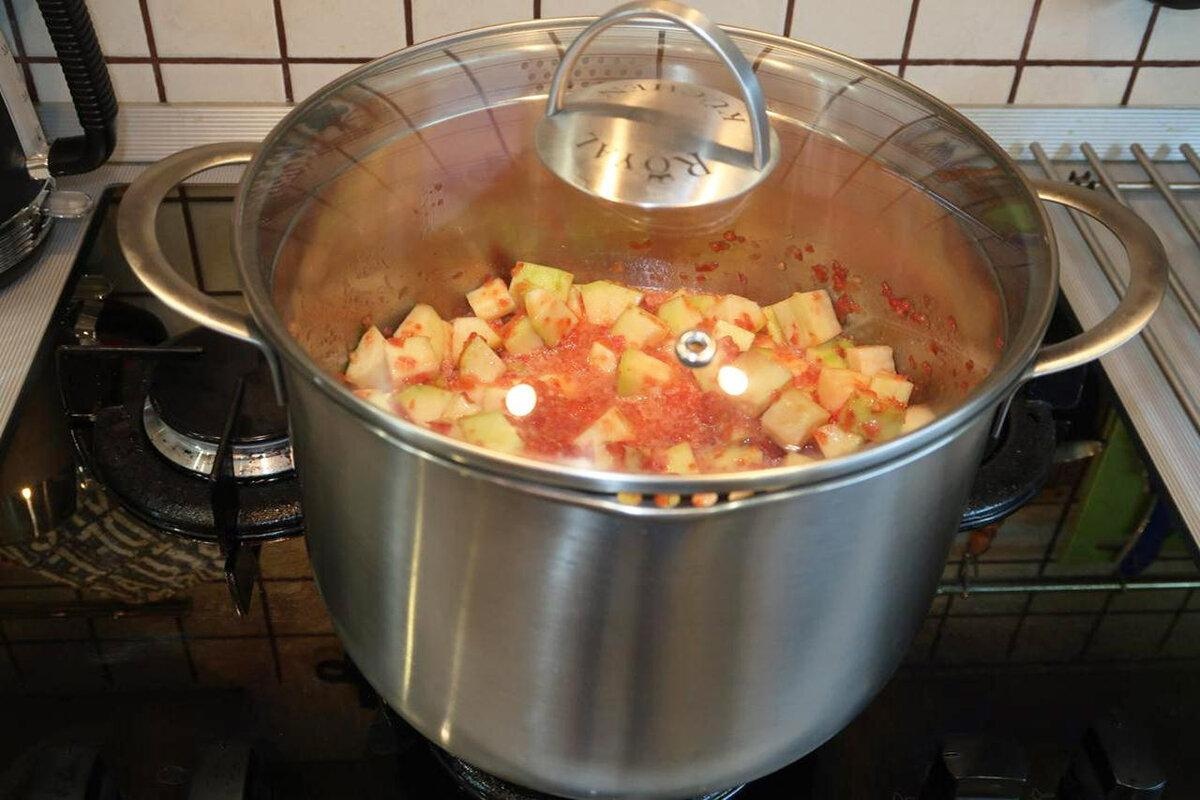 Перемешиваем, накрываем крышкой и ставим в огонь.