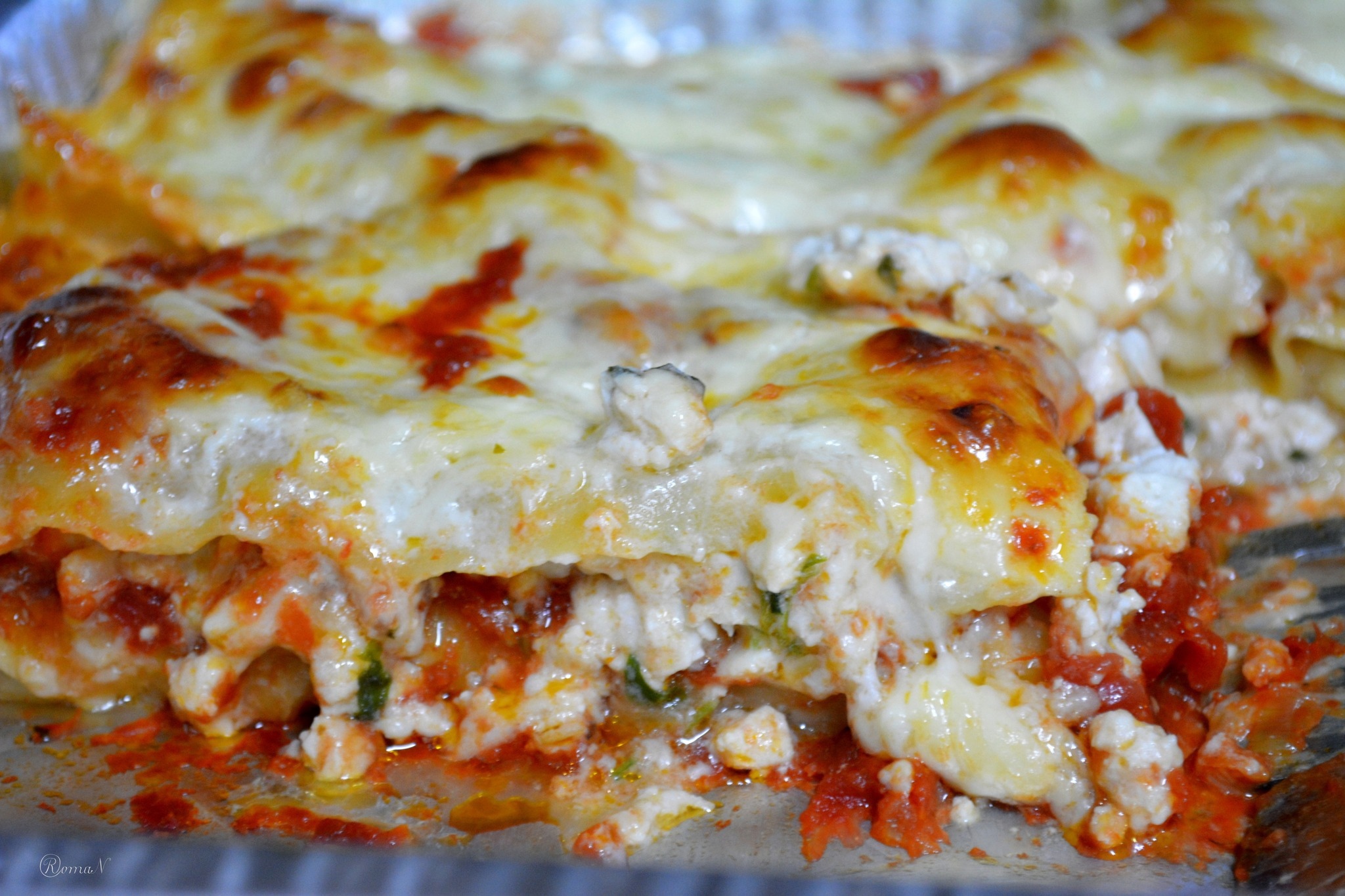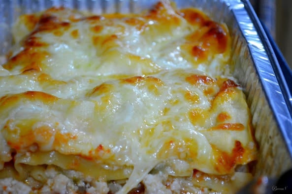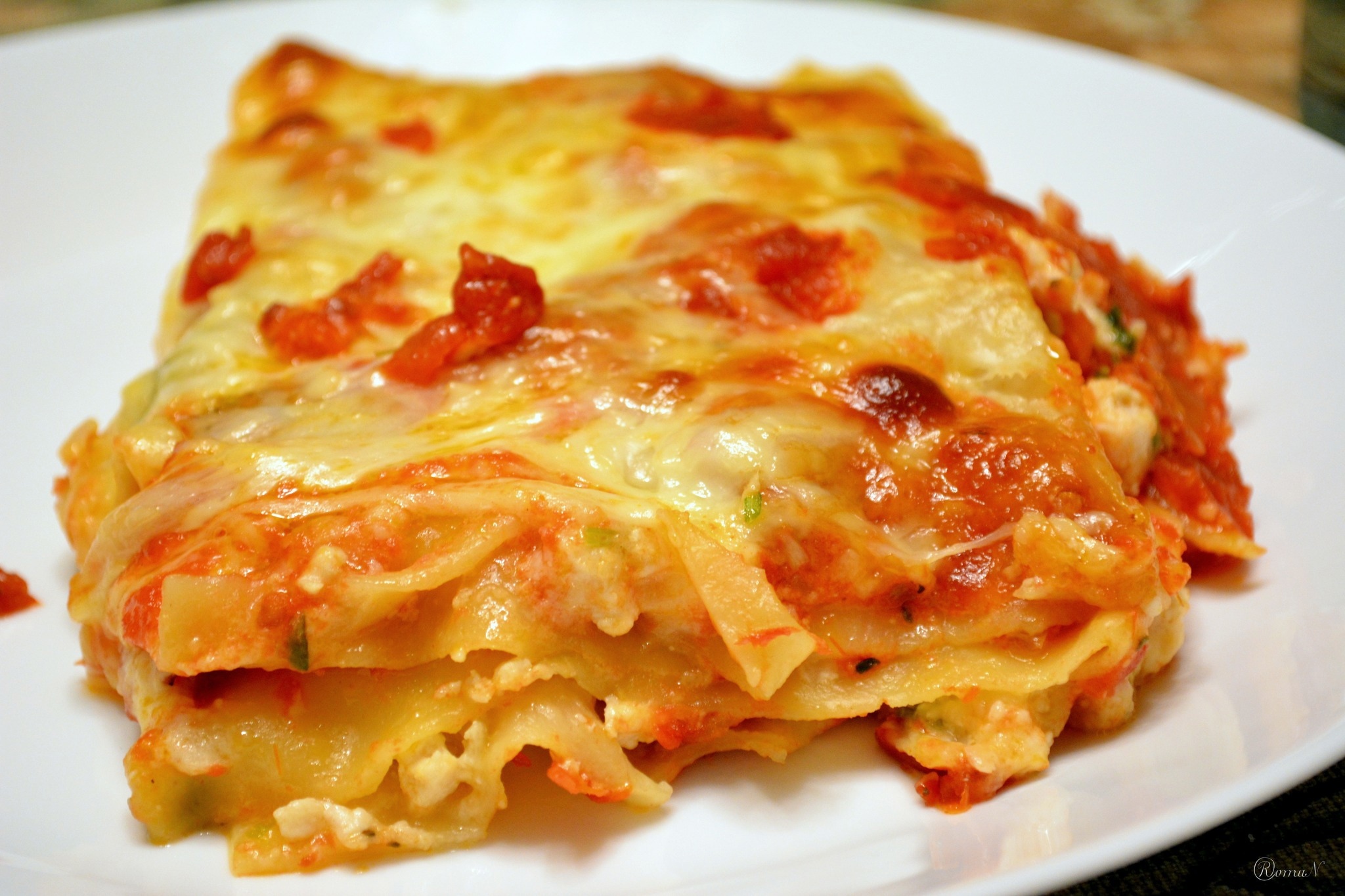 Берем противень для выпечки глубиной не менее 5 см. Выкладываем наши 3 части (красный, белый соусы и фарш) слоями равномерно в следующей последовательности: красный соус ~1 см на дно, затем листья лазаньи, фарш, белый соус, лазанья, красный соус, фарш, белый соус. Если позволяет глубина противня, то можно продолжать в той же последовательности, но последний слой должен быть всегда белый соус, а под ним толстый слой тертого сыра. (От себя добавлю: я люблю добавлять немного тертого сыра и между предыдущими слоями).