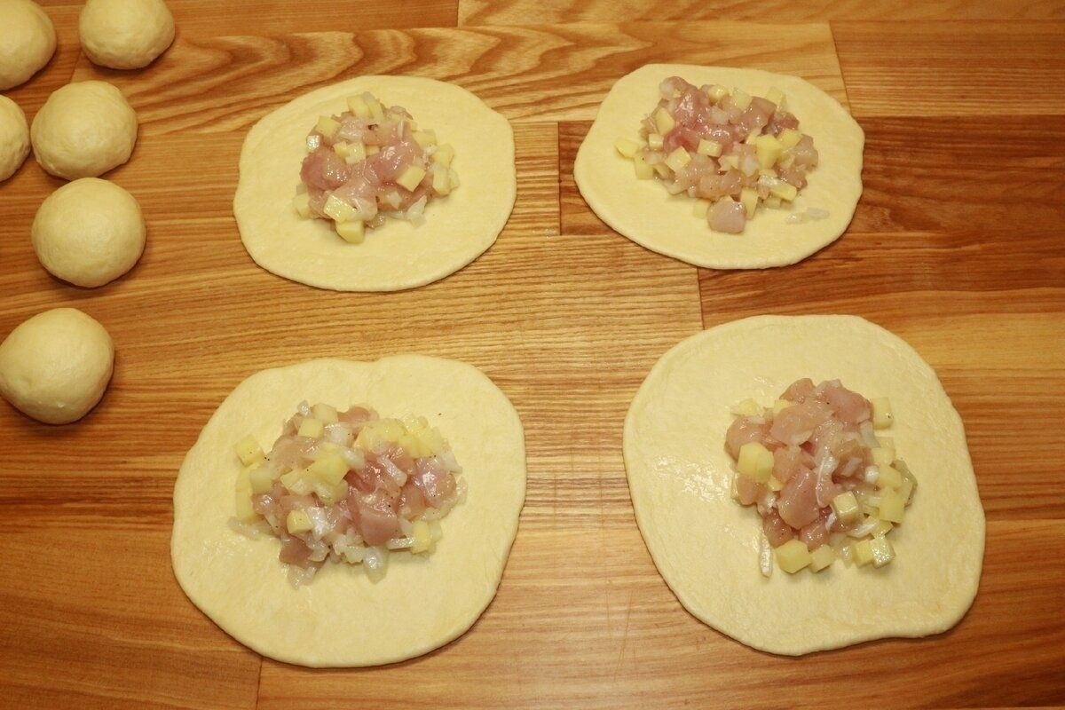 Тесто делю на примерно одинаковые 10-12 частей, скатываю из них шарики. Из этих шариков раскатываю лепешки, на середину лепешек выкладываю примерно одну столовую ложку начинки.
