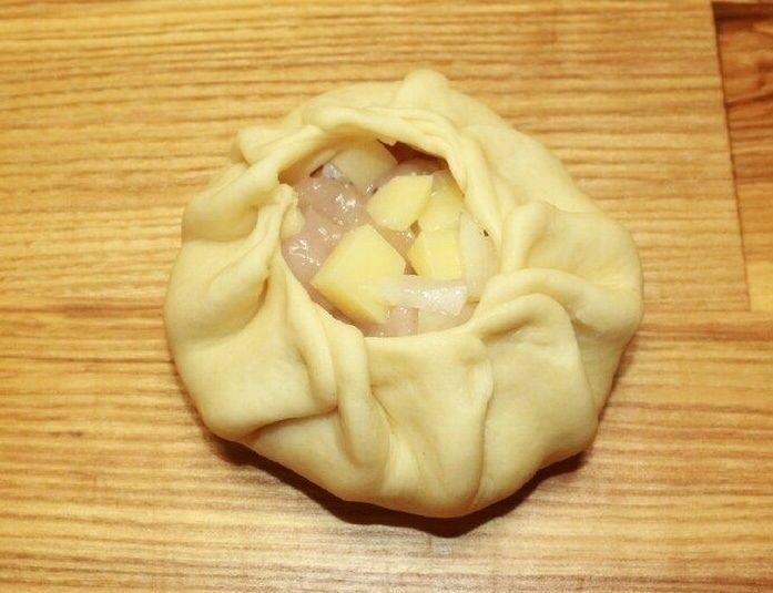 Собираю тесто в мешочек, защипывая таким образом, чтобы оставалось отверстие в середине так, как изображено на фото