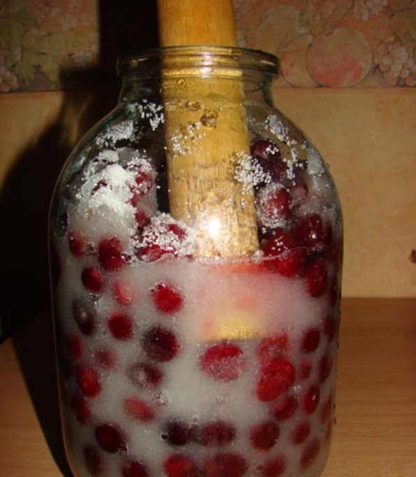 Добавить воду. Между содержимым и краем банки должно остаться немного свободного места, т. к. вишня будет бродить и подниматься. Затем размять вишню, я для этого использую скалку.