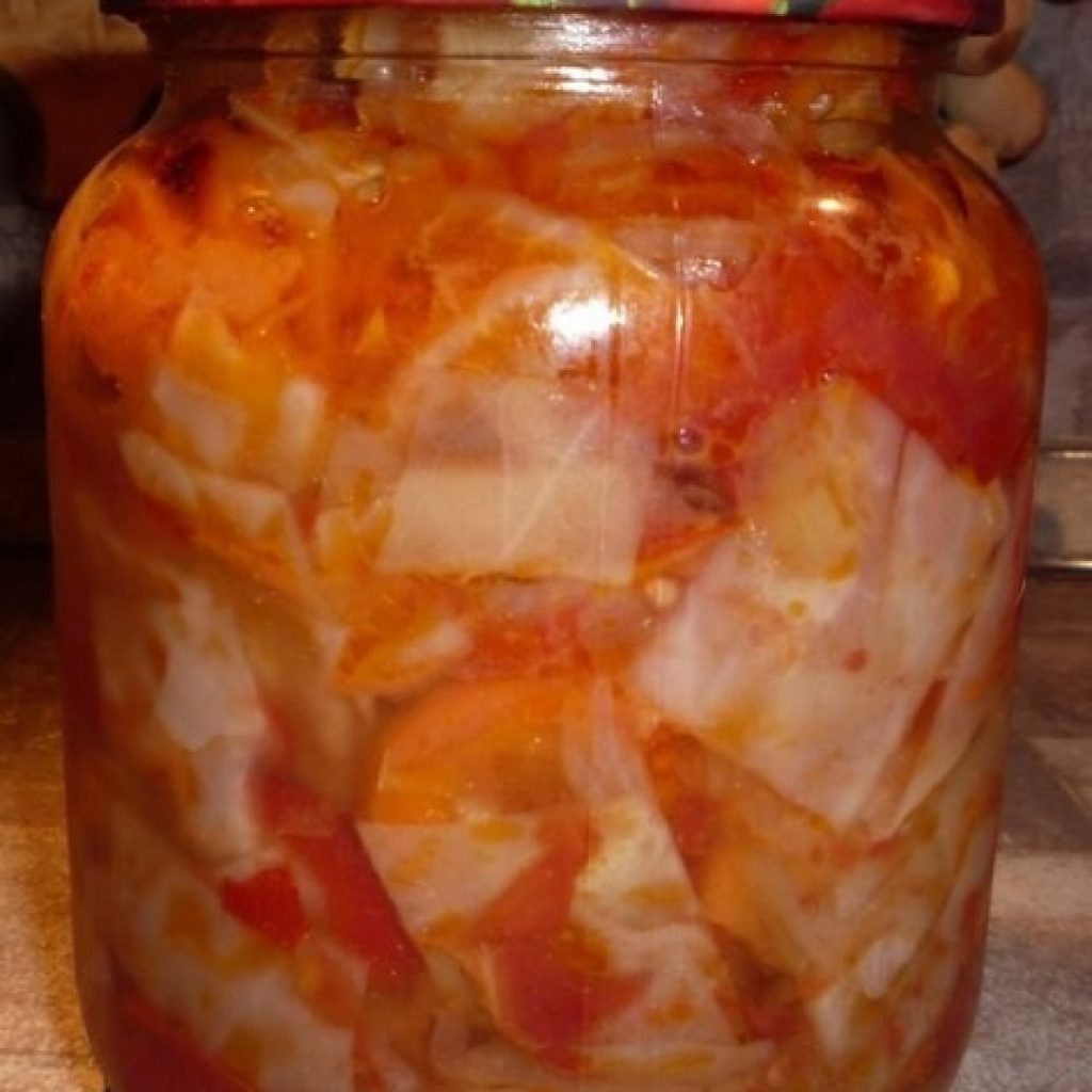 Шинкуется 1,3 кг капусты и смешивается нарезанным сломкой сладким перцем (0,5 кг), морковью (0,5 кг), и кольцами лука (0,3 кг). К овощной смеси добавляется петрушка (коренья и зелень) и сельдерей. Всё перемешивается и раскладывается в прокаленные пол-литровые банки, в которые предварительно наливается по 2 ст.л. обжаренного растительного масла. Салат тщательно утрамбовывается. Сверху насыпается сахар (по 1 ч.л. в каждую банку) и соль (по ½ ч.л.), уксус (2ст.л.) и кладётся по 3 горошинки чёрного и перца душистого. Банки накрываются крышками и отстаиваются час. После стерилизуются и закатываются.