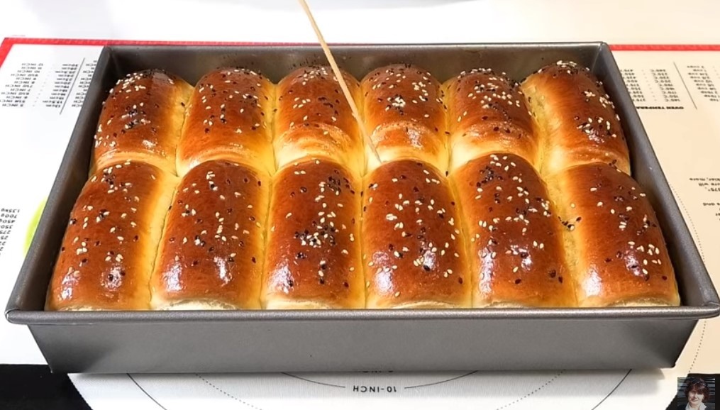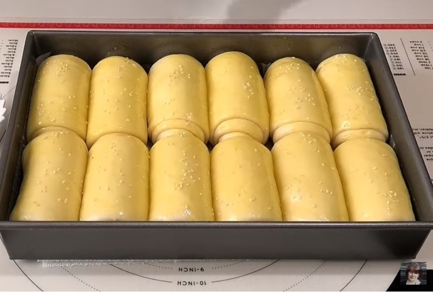 Смазываем булочки взбитым желтком и посыпаем кунжутом.